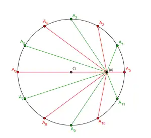 Dacă un cerc de centru O și rază r este secționat în 2n părți egale prin intermediul punctelor (unde n e un număr natural nenul) și se consideră un punct M situat pe semidreapta .