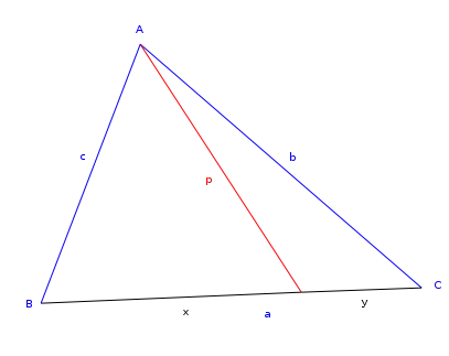 Fie a, b și c laturile unui triunghi. Fie p un segment din punctul A în punctul P de pe latura a care divide această latură în segmentele x and y. Atunci: