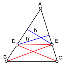 3) Este egală cu raportul segmentelor AE și EC, pentru că cele două triunghiuri au aceeași înălțime h'. Q.E.D.