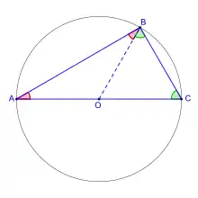 Dublul măsurii unghiurilor egale ale oricăror triunghiuri isoscele formate de raza OB e egal cu unghiurile externe de pe diametrul AC, din suma unghiurilor oricărui triunghi. Unghiurile formate de o parte a diametrului AC de raza OB sunt suplementare, suma lor constituind unghiul alungit, de măsură două unghiuri drepte.