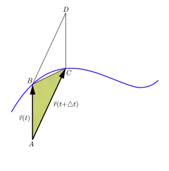 - Dacă se proiectează ecuația pe axa se găsește relația:De unde rezultă:[10] Această relație este o integrală primă a mișcării. Axa al reperului cartezian poate fi aleasă în lungul axei , în acest caz pentru componenta se pot scrie relațiile:sau:care la rândul ei este o integrală primă a mișcării.[10] Acestă integrală primă permite o interpretare geometrică legată de aria pe care o mătură raza vectoare.Fie și vectorii de poziție, în raport cu , ai punctului la momentele , respectiv . Din figura alăturată rezultă că aria elementară pe care o descrie (mătură) raza vectoare în elementul de timp poate fi aproximată prin aria triunghiului , adicăPrin proiectarea acestei relații pe axa și împărțirea la se obține expresiaunde este viteza areolară.[10] Combinând relațiile de mai sus se găsesc expresiile:, unde: