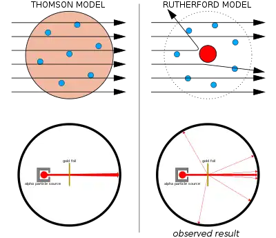 În experimentul Geiger–Marsden(d), Hans Geiger și Ernest Marsden(d) (colegi ai lui Rutherford care lucrau la sugestia lui), au propulsat particule alfa către foi subțiri de metal și au măsurat deformarea lor prin utilizarea unui ecran fluorescent.[13] Dată fiind masă foarte mică a electronilor, impulsul mare al particulelor alfa și concentrația scăzută a sarcinii pozitive în modelul budincii de prune, experimentatorii se așteptau ca toate particulele alfa să treacă prin folia metalică fără devieri semnificative. Spre surprinderea lor, o fracțiune mică din particulele alfa au fost puternic deviate. Rutherford a concluzionat că sarcina pozitivă a atomului trebuie să fie concentrată într-un volum foarte mic care produce un câmp electric suficient de intens pentru a devia particulele alfa atât de puternic.