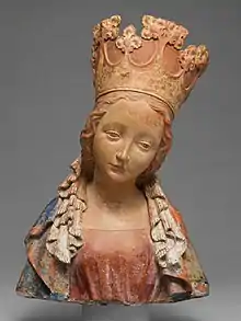 Bust boemian gotic internațional al Fecioarei Maria; circa 1390–1395; teracotă cu policromie;[1] 32,5 x 22,4 x 13,8 cm; Muzeul Metropolitan de Artă (New York City)