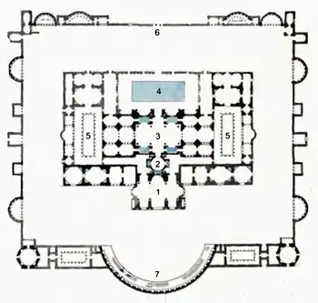 Cele două axe de simetrie ale complexului se întretaie în centrul foarte vastei bazilici (sau frigidarium, sala bazilicală). Axa mare se prelungea la sud-vest spre diferite băi (tepidarium, caldarium), în timp ce axa mică (nord-vest/sud-est) se deschidea spre gimnazii (palaestrae).