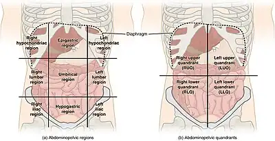 Pentru a promova o comunicare clară, de exemplu despre localizarea durerii abdominale a unui pacient sau o masă suspectă, cavitatea abdominală poate fi împărțită în nouă regiuni sau patru car.