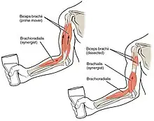 The muscle performing an action is the agonist, while the muscle which contraction brings about an opposite action is the antagonist. For example, an extension of the lower arm is performed by the triceps as the agonist and the biceps as the antagonist (which contraction will perform flexion over the same joint). Muscles that work together to perform the same action are called synergists. In the above example synergists to the biceps can be the brachioradialis and the brachialis muscle.[9]