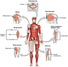 Anatomia primară a unui mușchi este cel mai important indicator al rolului său în organism. Un aspect deosebit de important al anatomiei primare a mușchilor este penarea sau lipsa acestora. În majoritatea mușchilor, toate fibrele sunt orientate în aceeași direcție, mergând pe o linie de la origine până la inserție. În mușchii penați, fibrele individuale sunt orientate într-un unghi în raport cu linia de acțiune, atașându-se la tendoanele de origine și inserție la fiecare capăt. Deoarece fibrele contractante converg în unghi față de acțiunea totală a mușchiului, iar modificarea lungimii este mai mică, dar această orientare permite mai multă forță prin mai multe fibre într-un mușchi de o anumită dimensiune. Mușchii penați se găsesc de obicei acolo unde schimbarea lungimii lor este mai puțin importantă decât forța maximă, cum ar fi rectus femoris. [14]