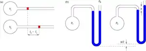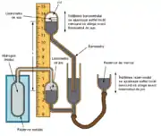 Deoarece un manometru cu tub U măsoară de fapt doar o diferență de presiuni (presiunea relativă), iar presiunea, trebuie cunoscută ca valoare absolută, termometrul cu volum constant se completează pe ramura care nu este legată la rezervor cu un barometru, conform figurii alăturate. Volumul se aduce la valoarea prescrisă cu ajutorul limnimetrului de jos poziționând rezervorul de mercur, iar înălțimea exactă a coloanei de mercur se citește poziționând barometrul cu ajutorul limnimetrului de sus.