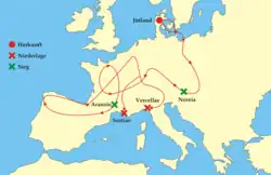 In anii 120 î.H. triburile cimbre părăsesc Jutlandul (regiunea daneză) și se alătură teutonilor traversând împreună teritoriul Germaniei de azi. Acest fapt este atestat de urmele istorice descoperite la Vukovar (Croația). Nu s-a reușit clarificarea faptului dacă cimbrii i-au urmat pe teutoni peste tot. Bătălia de la Noreia din anul 113 î.H. este descrisă de istoricii antici în mod diferit. Teutonii traversează Rinul și după relatările lui Gaius Iulius Caesar pustiesc Galia, după care vor suferi o înfrăngere în fața celților de pe teritoriul Belgiei. Germanicii (teutoni, cimbri, în plus și ambri, tiguri) pornesc contra așezărilor galezo-romane și vor înfrânge o armată romană în bătălia de la Arausio, (105 î.H.) loc în sudul Galiei. Aici triburile teutonice se vor despărți de cimbri care pornesc spre Spania pe când teutonii rămân în Galia. După doi ani se vor uni iarăși sub conducerea lui Teutobod împotriva romanilor. Armata romană fusese între timp (după Arausio, 105) total restructurată într-o armată de soldneri (soldați plătiți) de către consulul Gaius Marius. Conduși de acesta, romanii vor înfrânge distrugător triburile nordice în bătălia de la Aquae Sextiae (102 î.e.H.), in sudul Franței. După înfrângerea suferită resturile teutonice se vor așeza pe valea lui Maas iar prin secolul II în regiunea râului Main.