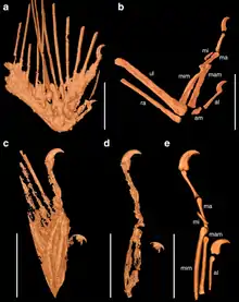 Mâinile erau, de asemenea, foarte diferite între diferitele grupuri de teropode. Cea mai obișnuită formă printre teropodele non-aviare este un apendice format din trei degete[29] cu gheare ascuțite. Unele teropode primitive (de exemplu, Herrerasaurus, Eoraptor) aveau patru degete. Se crede că scopul acestor membre anterioare ar fi fost diferit pentru diferite familii. Spinozauridele ar fi putut să-și folosească brațele puternice pentru a prinde pește. Se crede că unii maniraptorani mici, cum ar fi scansoriopterygidele, și-au folosit membrele anterioare pentru a urca în copaci.[13] Aripile păsărilor moderne sunt folosite în principal pentru zbor, deși la anumite grupuri ele s-au adaptat și pentru alte scopuri. De exemplu, păsările acvatice, cum ar fi pinguinii, își folosesc aripile pentru înot.