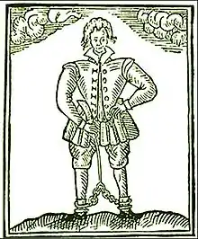 ![]() Basorelief în lemn luând în derâdere Nashe ca un obișnuit al închisorii (din lucrarea lui Richard Lichfield The Trimming of Thomas Nashe, Gentleman (1597) | |