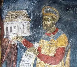 Tabloul votiv din Biserica "Adormirea Maicii Domnului" a Mănăstirii Humor, în care logofătul Toader Bubuiog oferă biserica Mântuitorului Iisus Hristos şi Maicii Domnului