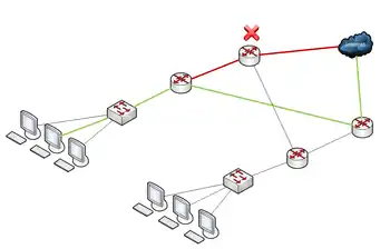 - Rețelele de calculatoare și cele de comunicații dispun de obicei de componente redundante, vezi exemplul din imaginea alăturată. Aici, când se strică elementul marcat cu un X roșu, drumul roșu se întrerupe, dar în locul lui se poate folosi (în mod automat) drumul verde.