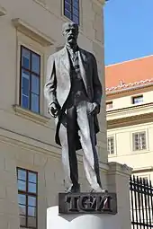 Tomáš Garrigue Masaryk (cehă: [ˈtomaːʃ ˈɡarɪk ˈmasarɪk]; n. , Hodonín, Imperiul Austriac – d. , Lány(d), Středočeský kraj, Cehia), cunoscut și sub numele de Thomas Masaryk, a fost un filozof, sociolog și om politic cehoslovac, care a militat pentru independența Cehoslovaciei în timpul Primului Război Mondial și a devenit fondatorul și primul președinte al Cehoslovaciei. Este numit din acest motiv „Președintele eliberator”.[24] Inițial, el și-a dorit să reformeze monarhia habsburgică într-un stat federal democratic, dar, în timpul Primului Război Mondial, a început să susțină abolirea monarhiei și, cu ajutorul Aliaților a reușit în cele din urmă acest lucru. A fost, de asemenea, nominalizat de șaptesprezece ori la Premiul Nobel pentru Pace .[25]