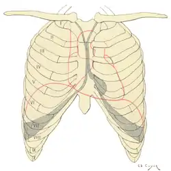 Protecție pe cutia toracică a inimii, plămânilor și diafragmei. Zonele umbrite indică întinderea cavităților pleurale care nu au umplut plămânii.