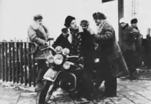 Regizorul polonez Andrzej Wajda (pe motocicletă) în timpul filmărilor la Totul de vânzare.