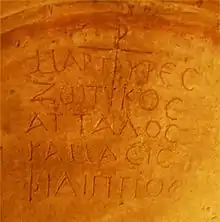 ![]() Inscripţie din cripta celor patru martiri dobrogeni Zotikos, Attalos, Kamasis şi Filippos |