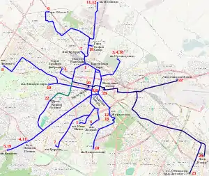1. „Route network of tram lines of Sofia's public transportation” (PDF). Sofia Urban Mobility Center. . Accesat în .