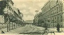 [[{{{2}}}|Terminalul cu patru linii al tramvaiului cu cai de pe actuala Piața Sfântul Gheorghe, cu vedere spre fosta Biserică a Seminarului.]](de)[traduceți]