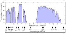 Transmitanța atmosferică a Pământului pe o traiectorie de 1 milă nautică la nivelul mării (regiunea infraroșu)[1]