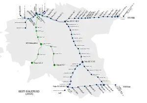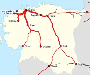 - Tallinn– Lelle–(Pärnu)–( Mõisaküla), 141,4 kilometri (87,9 mi) (anterior 190.0 km). A existat o conexiune internațională de la Mõisaküla la Letonia, dar porțiunea Pärnu – Mõisaküla a fost abandonată în 2008.[8][9] Secțiunea Lelle-Pärnu a fost închisă definitiv pentru transportul de călători la 9 decembrie 2018, deoarece a necesitat o renovare de 17 milioane de euro. Un serviciu feroviar către stația Pärnu va fi reluat odată cu deschiderea liniei Rail Baltic.[10][11]