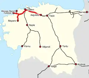 - Tallinn–Keila–Paldiski, 47,7 kilometri (29,6 mi). Trenurile de călători sunt operate de Elron (rutele Tallinn– Pääsküla, Tallinn – Keila, Tallinn – Paldiski și Tallinn– Klooga-rand).