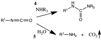 Izocianatul care a fost obținut în urma reacției de transpoziție poate fi utilizat pentru obținerea derivaților de uree, prin reacția cu aminele (4), sau pentru obținerea aminelor, prin reacția de hidroliză (5).