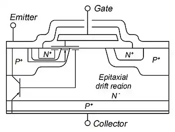 O celulă IGBT este construită în mod similar cu un MOSFET de putere cu construcție verticală cu canale n, cu excepția faptului că drenul n+ este înlocuit cu un strat colector p+, formând astfel un tranzistor cu joncțiuni bipolare PNP vertical.