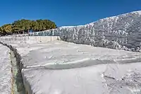 - travertine compacte. Acestea sunt dense și stratificate în bancuri groase (20–40 m) sau în lamine subțiri, milimetrice; sunt albe, alb-gălbui, brune, care alternează în întreaga crustă. Se presupune că stratificarea se datorează depunerii sezoniere, în sensul că vara s-au depus benzile mai groase și deschise la culoare, iar iarna benzile subțiri și închise la culoare. Aceste travertine se mai cunosc și sub denumirile de onyxul peșterilor sau marmură onyx.