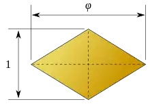 Raportul dintre diagonala lungă și cea scurtă a fețelor este egal cu secțiunea de aur, φ, astfel încât unghiurile ascuțite de pe fiecare au 2 tan−1(1φ) = tan−1(2), adică aproximativ 63,43°. Un astfel de romb este un romb de aur.