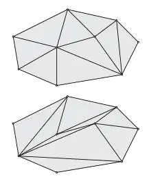 În geometria algoritmică(d) triangularea unei mulțimi de puncte din spațiul euclidian este un complex simplicial care acoperă înfășurătoarea convexă a lui și ale cărui vârfuri fac parte din .[1] În plan (când este o mulțime de puncte în ), triangulările sunt formate din triunghiuri, împreună cu laturile și vârfurile acestora. Unii autori cer ca toate punctele lui să fie vârfuri ale triangulărilor sale.[2] În acest caz, o triangulare a unei mulțimi de puncte din plan poate fi definită alternativ ca un set maxim de muchii care nu se intersectează decât în punctele . În plan, triangulările sunt cazuri particulare grafuri planare cu muchii drepte.