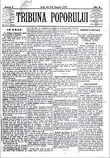 „ÎN ARAD - (*) „Tribuna Poporului” apare azi în propria tipografie. Însemnătatea acestui fapt se va putea judeca numai dacă cititorii își vor aminti următoarele: înainte cu doué-zeci - și șeapte de ani în Arad era o singura foaie politică, dar și aceia germană, „Arader Zeitung”; azi ziarul german și cititorii sëi au dispărut însă în oceanul maghiarisării, ear Ungurii au trei foi cotidiene și una séptëmânală. Ar fi fost deci o rușine și un semn că dăm îngrijitor de tare îndărăt, dacă noi Românii, în mijlocul cărora Ungurii din Arad sunt numai o picătură, n'am fi fost în stare să întemeiem un ziar politic, care, pe lângă interesele generale românești, să apere și interesele locale a celor peste jumătate milion Romani din eparchia Aradului.[3]”