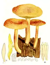 - Caracteristici microscopice: are spori albi, hialini (translucizi), cu o picătură de ulei în centru, ovoidali și apar în mase. Mărimea lor este de 6-8 x 4-5,5 microni.[4][5][6]