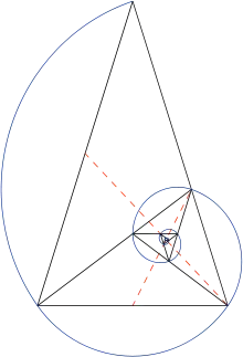 Triunghiul de aur este folosit pentru a forma unele puncte ale unei spirale logaritmice. Prin divizarea în două a unuia dintre unghiurile de bază se creează un nou punct care, la rândul său, formează un alt triunghi de aur.[4] Procesul poate fi continuat la nesfârșit, creând un număr infinit de triunghiuri de aur. O spirală logaritmică poate fi trasată prin aceste vârfuri. Această spirală este cunoscută și sub numele de spirală echiunghiulară, termen creat de René Descartes. „Dacă o linie dreaptă este trasată de la pol la orice punct al curbei, aceasta taie curba exact în același unghi”, de unde denumirea de „echiunghiulară”.[5]