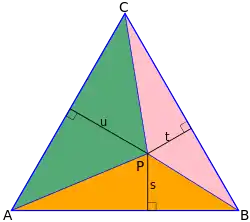Distanțele de la un punct din interiorul triunghiului la laturi însumate egalează lungimea unei înălțimi (teorema lui Viviani).