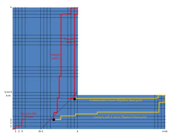 Această demonstrație implică o extensie a metodei reflexiei Andres așa cum este utilizată în a doua demonstrație pentru numărul Catalan la diferite diagonale. Următoarele arată cum fiecare cale de la din stânga jos până la din dreapta sus a diagramei care prezintă constrângerea poate fi reflectată și în punctul final .