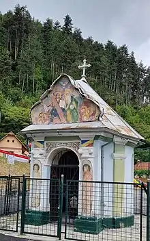 Crucea din piatră este pictată, redând scena Răstignirii lui Isus. Pe perete sunt scenele bisericești, reprezentând pe Arhanghelul Mihail și Sf. Parascheva.