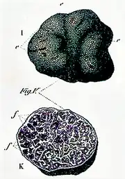 - Corpul fructifer: se dezvoltă subteran, de obicei la o adâncime de 5-15 cm, având în mod general un diametru de maximal 5 cm, fiind sferic până turtit neregulat. Peridia (înveliș al corpului de fructificație la unele ciuperci)[10] destul de groasă (150-300 µm) care nu poate fi decojită, este acoperită cu mici poligoane iregulare și aplatizate de numai 0,5-2 mm, cuticula fiind câteodată aproape netedă, de exemplu la exemplarele recoltate în habitatele din Transilvania.[11] Coloritul pe exterior variază de la brun roșcat la negricios, fiind gălbuie pe partea inferioară. Gleba este fermă, solidă, maro-purpurie, dar neagră la maturitate, fiind străbătută de numeroase vinișoare meandre mai largi sau mai subțiri de culoare albă.