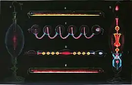 Desen al tuburilor Geissler într-o carte de fizică în limba franceză din 1869, arătând câteva din numeroasele forme decorative posibile.