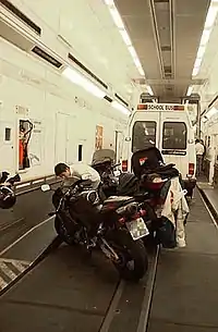 - Navetele Eurotunnel transportă automobile, dube și autocare între terminalele Sangatte (Calais/Coquelles) și Folkestone. Vagoanele închise, unele cu două etaje, permit șoferilor să rămână în mașini pe toată durata călătoriei. Trenurile au fost cunoscute și sub denumirea de Le Shuttle.