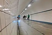 Tunelul perfect orizontal a fost săpat prin argilă de Boom cu un scut de forat manual. Căptușeala tunelului este alcătuită din elemente prefabricate din fontă îmbinate cu nituri din plumb. Costul total al construcției s-a ridicat la 40 de milioane de franci (circa 1 milion de euro). Pentru a reda aspectul inițial al tunelului au fost păstrate elemente originale precum cele două clădiri de acces, scările rulante sau vechile indicatoare și semne de avertizare.