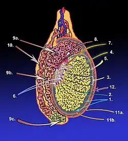 ![]() Diagrama principalelor componente ale testiculului uman adult: 1. tunică albuginea, 2. sept testicular, 3. lobul testicular, 4. mediastin testicular, 5. tubuli seminiferi contorți, 6. tubuli seminiferi drepți, 7. rețeaua testiculară, 8. canale eferente testiculare, 9a. capul epididimului, 9b. corpul epididimului, 9.c coada epididimului, 10. canal deferent, 11a. tunică vagală (lamina parietală), 11b. tunică vagală (lamina viscerală), și 12. cavitatea tunicii vagale. | |