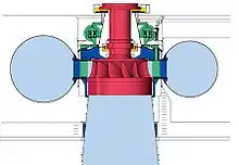 Vedere laterală a unei turbine Francis verticale. Aici apa intră orizontal într-o țeavă în formă de spirală (carcasă spirală) înfășurată în jurul rotorului turbinei și iese vertical în jos prin centrul turbinei.