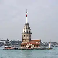 Turnul Fecioarei la intrarea sudică a Bosforului, cu promontoriul Sarayburnu în fundal.