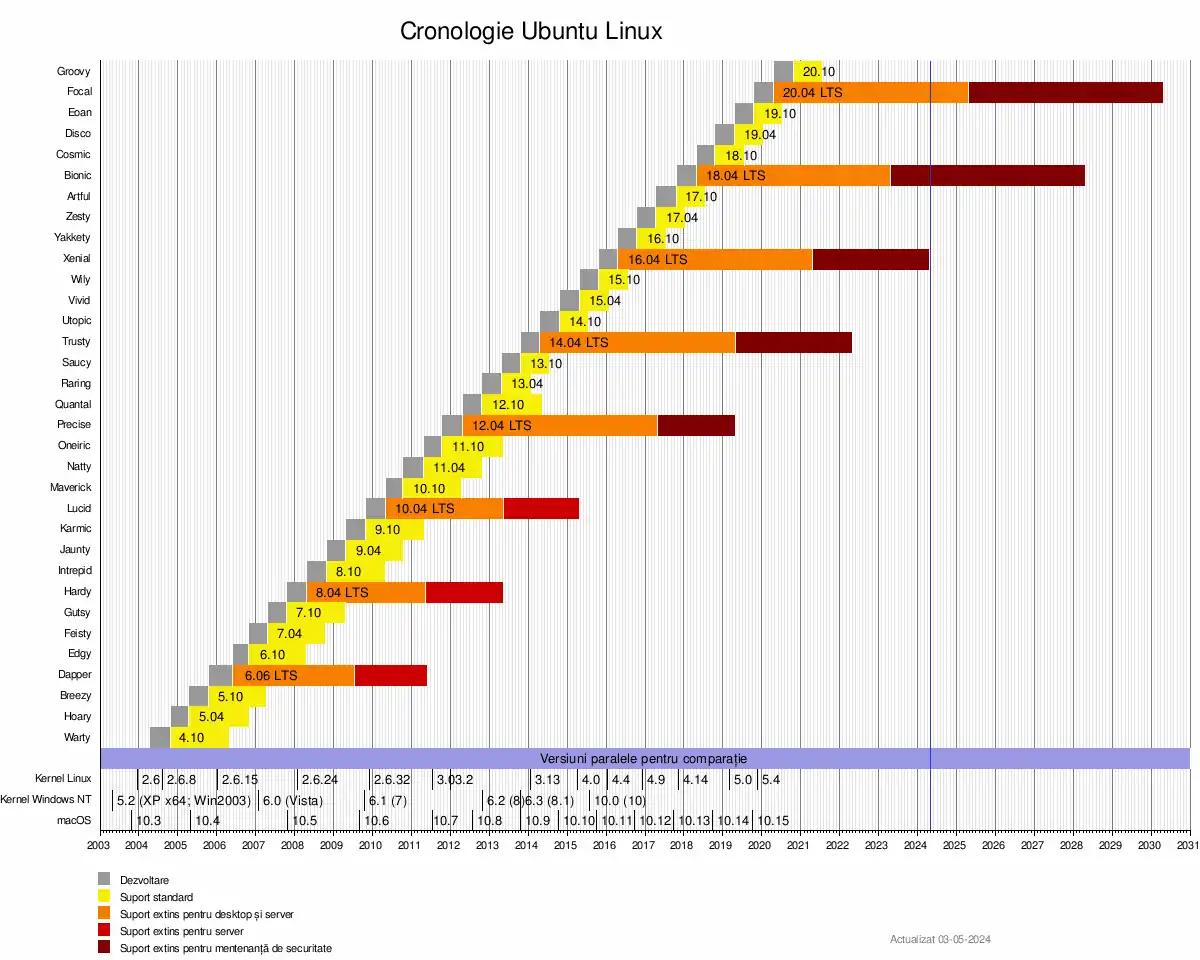 | 12.04 LTS | 26 aprilie 2012 | Precise Pangolin | 3.2, 3.5, 3.8, 3.11, 3.13 | aprilie 2017 | |