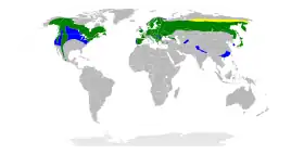 | Răspândirea speciei pe harta lumii. Zonă de cuibărire (vara) Habitat permanent (tot anul) Zonă de iernare | |