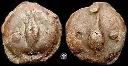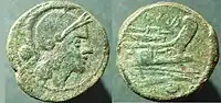 În emisiunile monetare romane directe tipurile folosite au fost: un os (circa 289-245 î.Hr.), un bob de grâu (circa 280-245 î.Hr.), capul cu cască al zeiței Roma (de la circa 240 î.Hr.). Semnul indicator al valorii era o globulă.
