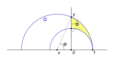 În modelul semiplanului Poincaré(d) al planului hiperbolic se poate stabili relația dintre φ și a prin geometria euclidiană. Fie Q semicercul cu diametrul pe axa x care trece prin punctele (1,0) și (0,y), unde y > 1. Deoarece Q este tangentă la semicercul unitate cu centrul în origine, cele două semicercuri reprezintă linii hiperbolice paralele. Axa y traversează ambele semicercuri, formând un unghi drept cu semicercul unitate și un unghi variabil Φ cu Q. Unghiul din centrul lui Q subîntins de raza la (0, y) este de asemenea Φ deoarece cele două unghiuri au laturile perpendiculare, din partea stângă spre partea stângă și din partea dreaptă spre partea dreaptă. Semicercul Q își are centrul în (x, 0), x < 0, deci raza sa este 1 − x. Astfel, pătratul razei lui Q este