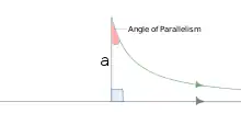 Fiind dat un punct care nu este pe dreaptă, se coboară din el o perpendiculară pe dreaptă. Fie a lungimea acestui segment perpendicular și cel mai mic unghi astfel încât linia trasată prin punct nu intersectează dreapta dată. Deoarece cele două laturi sunt paralele asimptotic,