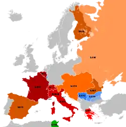 Uniunea Monetară Latină și țările aliniate în 1914: * albastru – statele membre ale uniunii monetare; * roșu participare printr-un acord bilateral; * verde – participare printr-o aliniere unilaterală; * galben colonii.